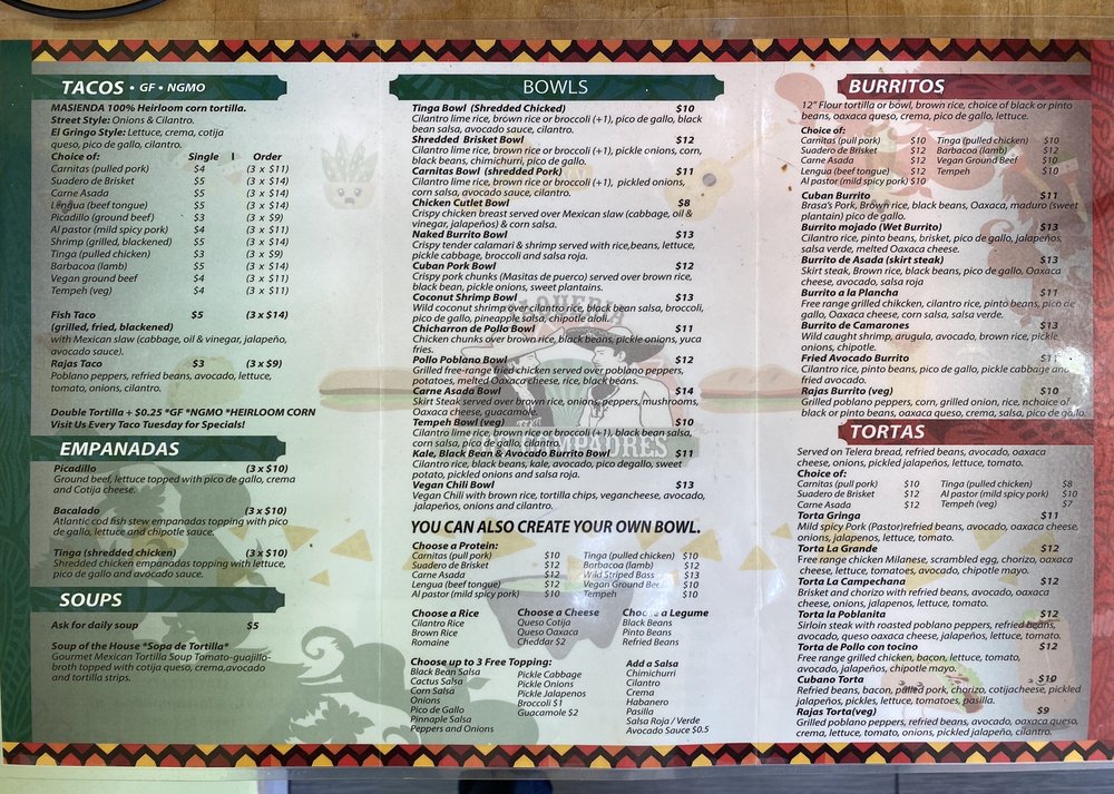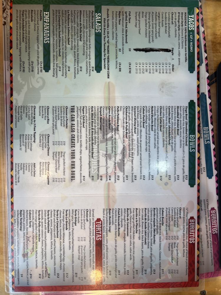 Grilled poblano, peppers, corn, grilled onion, Oaxaca queso, crema, salsa and pico de gallo. Flour tortilla, brown rice, choice of beans, and lettuce.