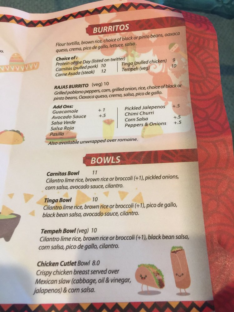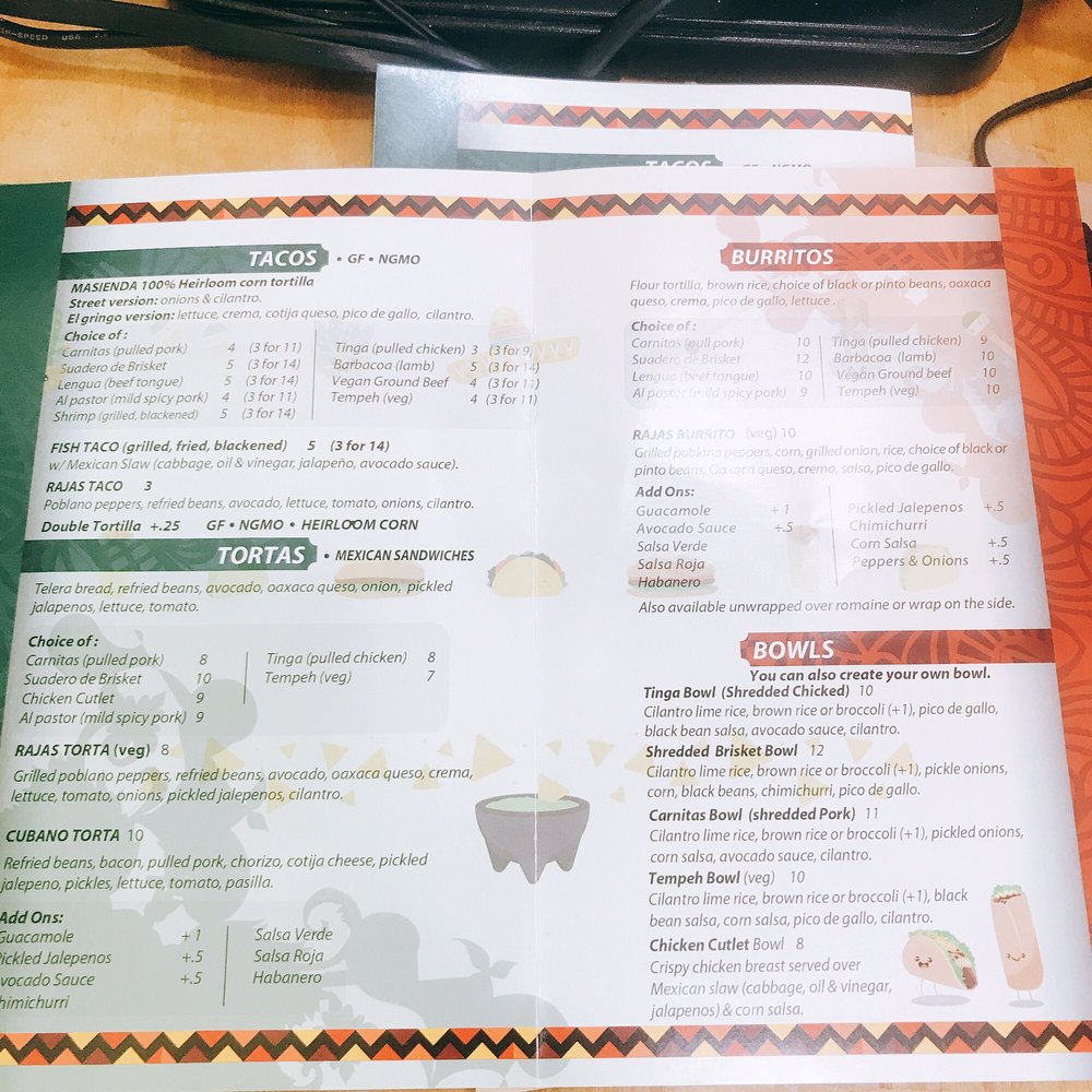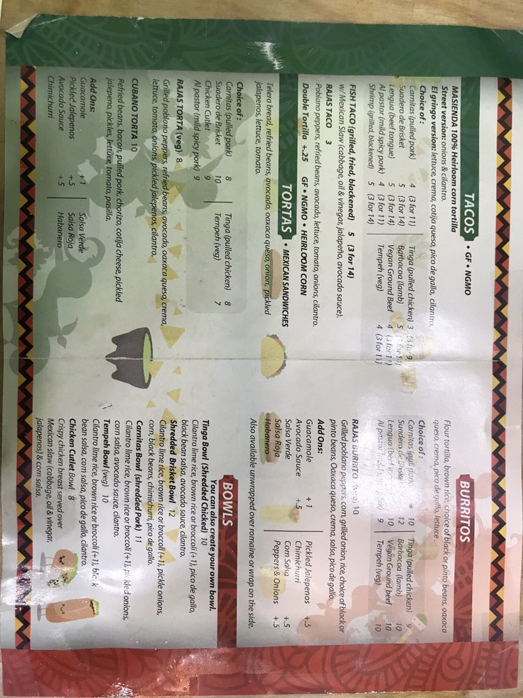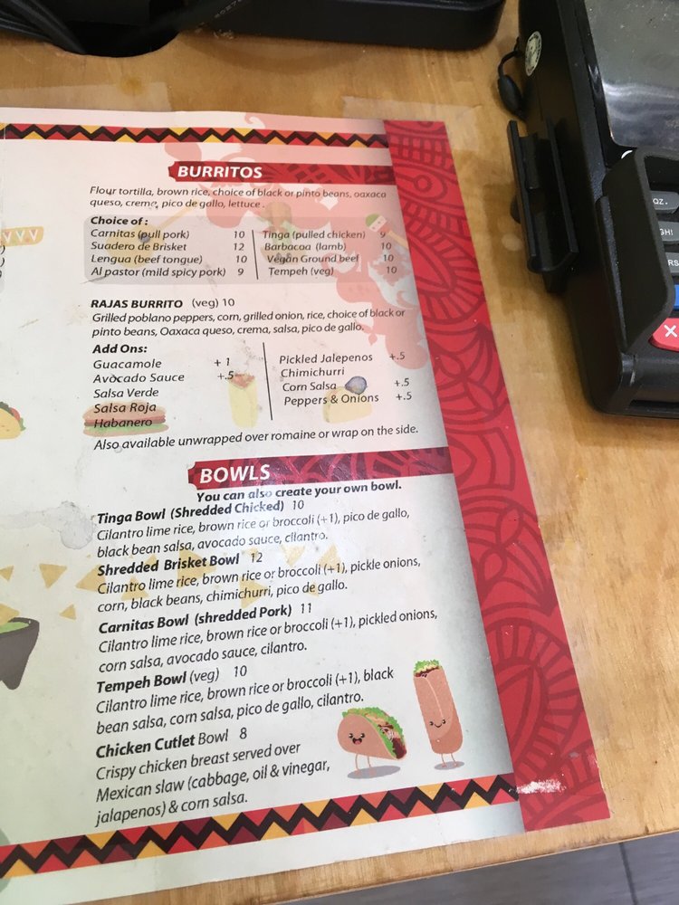 Flour Tortilla, cilantro rice, pinto beans, brisket, pico de gallo, jalapenos. On top salsa verde with melted cheese.